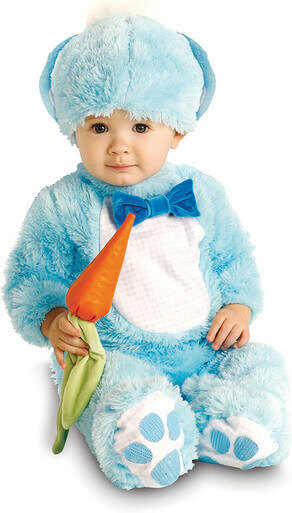 - Package contains jumpsuit, headpiece with ears, and carrot rattle
