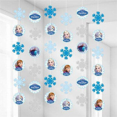 Pack of 6 hanging string decorations featuring Anna, Elsa and Olaf.