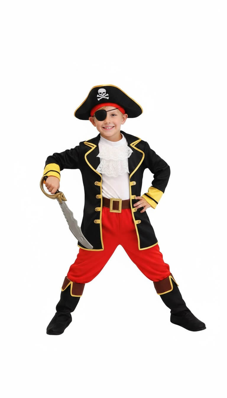 This King Pirate costume is 6 piece clothing which comes with a red jacket with red trousers attached with boot covers, vest, hat, eye mask and belt. This is a must have fancy dress designed around Halloween theme. Your kid can definitely win all the attention and the school competition with this terrific dress.