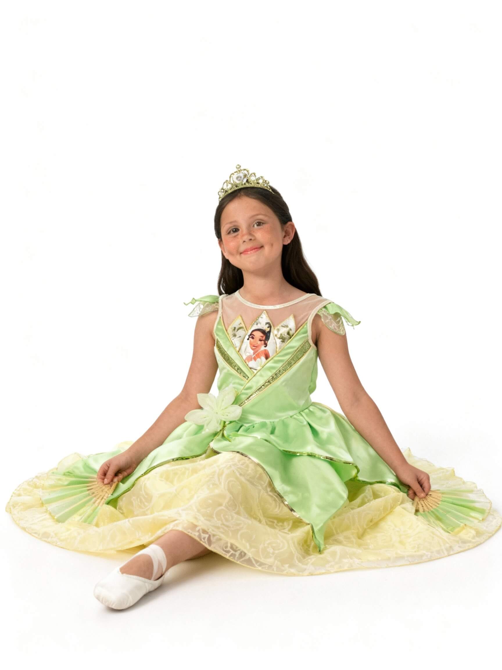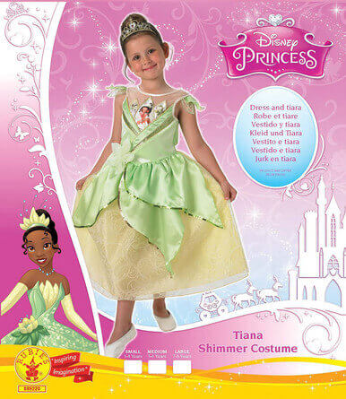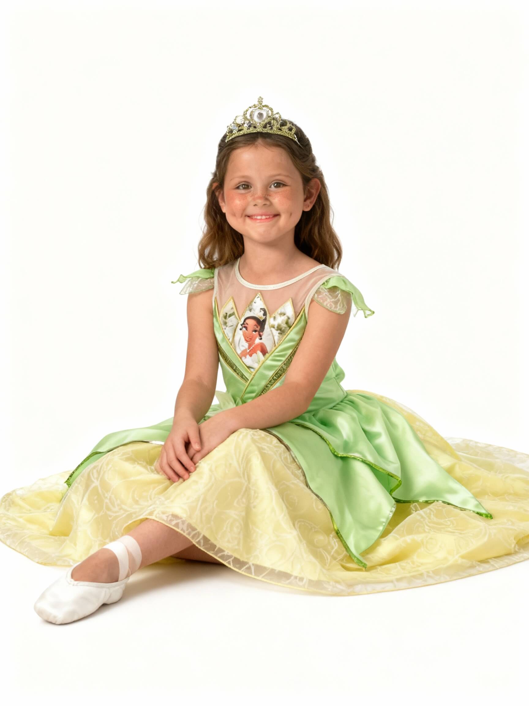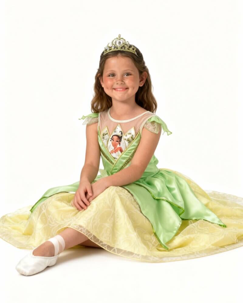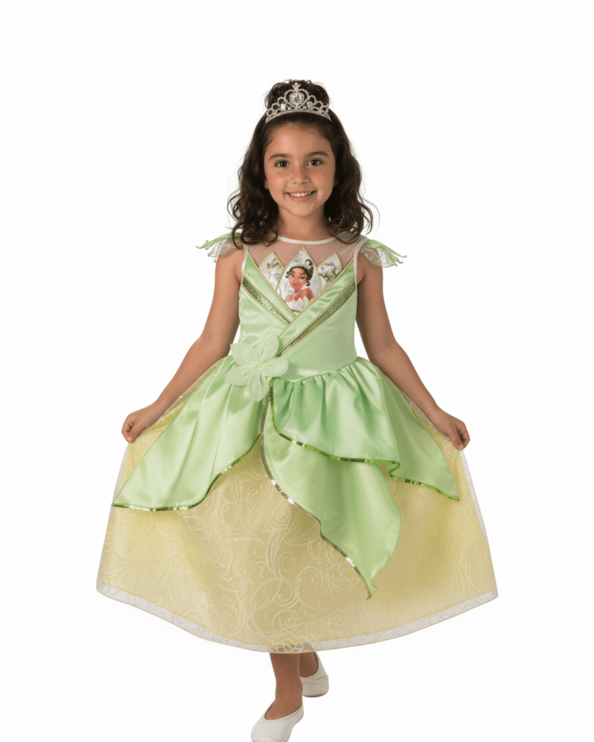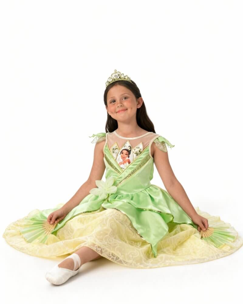 It contains a dress as well as a tiara (shoes not included). This dress represents that of the sublime Princess Tiana. It is made in a satin effect fabric of green and yellow color. On the bust of this dress, you will find a drawing of Tiana. A flower adorns the waist. Sections of green fabric in the shape of a petal edged with sequins fall on the ivory tulle skirt with arabesques. As for the silver and golden tiara, it has a print of the pretty princess. This complete costume will be ideal to embody your favorite Disney princess on the occasion of a disguised party, Carnival, and for any other festive event!