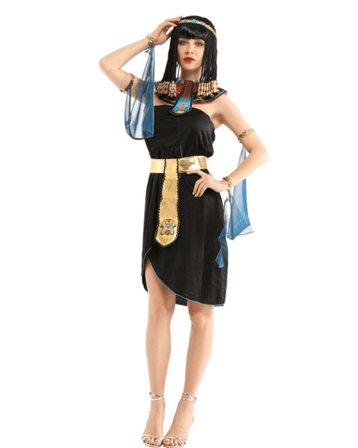 Featuring a sleek black dress enhanced with rich gold details, this costume reflects grace, strength, and timeless beauty. The Egyptian-style collar, belt, and flowing accents create a regal silhouette that turns every entrance into a statement.